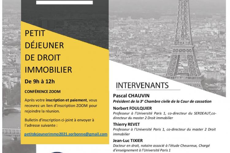 Le Département Sorbonne Etude et Recherche en Droit de l'Environnement, de l'Aménagement, de l'Urbanisme et du Tourisme (S.E.R.D.E.A.U.T.) a le plaisir de vous convier au Petit-déjeuner débat "Droit immobilier" organisé par le Master 2 Construction Urbanisme et Contrats, animé par la Cour de cassation et le S.E.R.D.E.A.U.T., qui se tiendra à distance le vendredi 12 mars de 9h00 à 12h00.