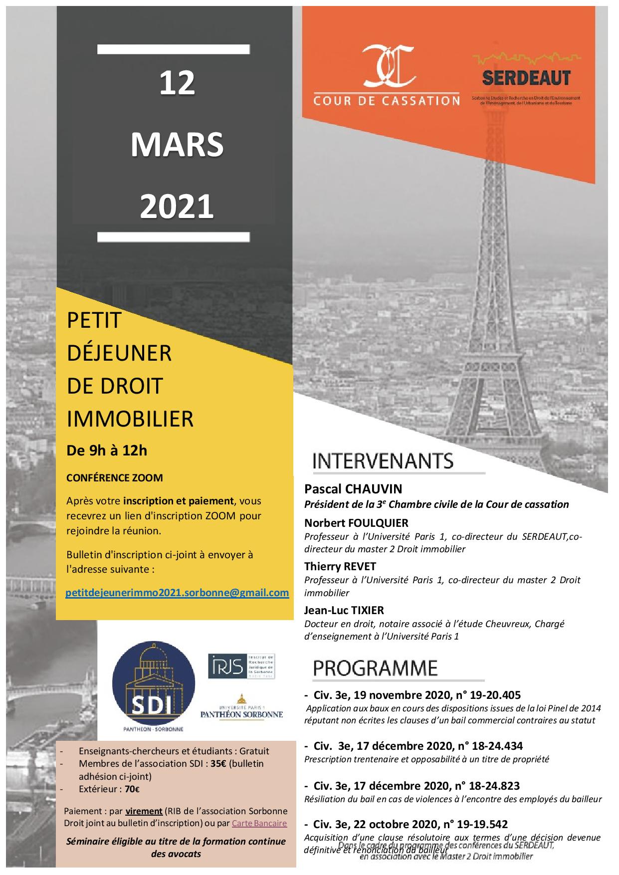 Le Département Sorbonne Etude et Recherche en Droit de l'Environnement, de l'Aménagement, de l'Urbanisme et du Tourisme (S.E.R.D.E.A.U.T.) a le plaisir de vous convier au Petit-déjeuner débat "Droit immobilier" organisé par le Master 2 Construction Urbanisme et Contrats, animé par la Cour de cassation et le S.E.R.D.E.A.U.T., qui se tiendra à distance le vendredi 12 mars de 9h00 à 12h00.