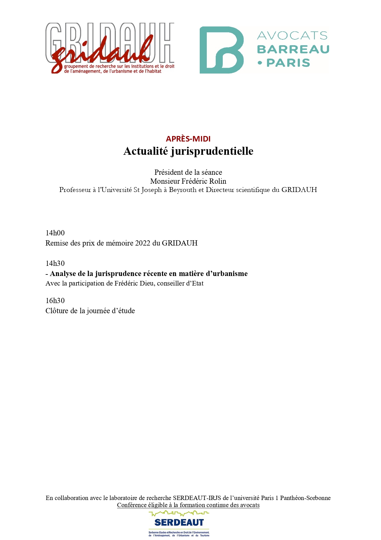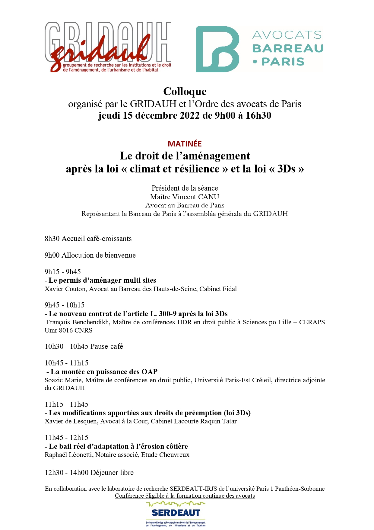 Le Gridauh et l'Ordre des avocats de Paris organisent une journée d'études Le droit de l'aménagement après la loi "climat et résilience" et la loi "3Ds" le 15 décembre prochain de 9h00 à 16h30.
