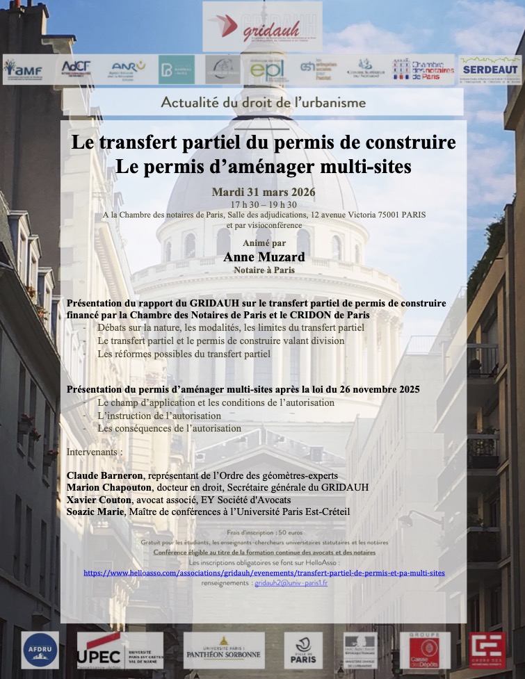 Il s'agit d'un séminaire de restitution d'un rapport du GRIDAUH sur le transfert partiel de permis de construire financé par la Chambre des Notaires de Paris et le CRIDON de Paris. Vous trouverez le rapport ici : Rapport sur le transfert partiel de permis de construire