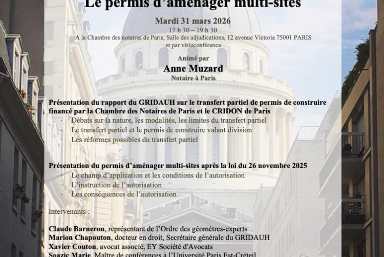 Le séminaire se tiendra le mardi 31 mars 2026, de 17h30 à 19h30, à la Chambre des notaires de Paris située au 12 avenue Victoria 75001 PARIS et par visioconférence.